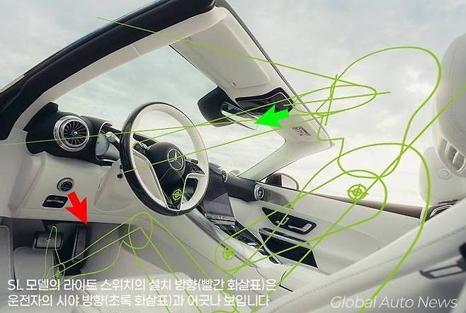 이 사진은 벤츠 SL의 운전석에 차체 설계용 인체 모델을 적용해 분석한 것인데요, 초록 화살표 방향이 운전자 시야 방향인 반면 빨간 화살표는 그렇지 않습니다. 눈으로 보고 조작하기 어려운 각도로 설치한 이유가 궁금하지 않을 수 없습니다.