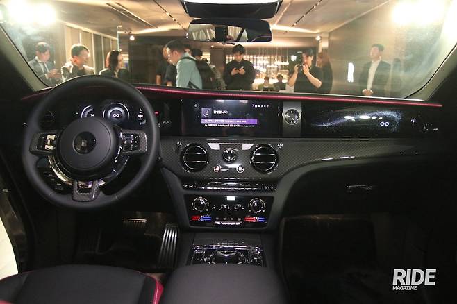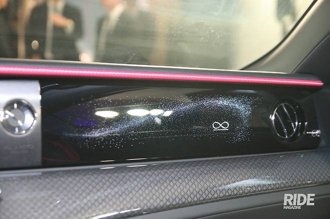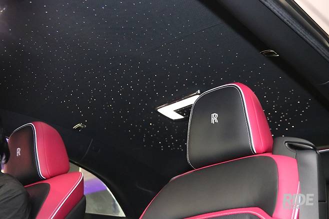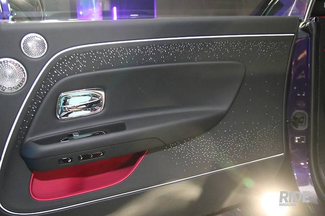 실내는 롤스로이스답게 눈부신 별의 향연이 펼쳐진다. 대표적인 인테리어 요소인 스타라이트 헤드라이너가 큰 호평을 받자 이번에는 이를 도어에도 적용한 것. 여기에 대시보드의 일루미네이티드 페시아에도 블랙 배지를 상징하는 인피니티 심볼과 함께 5,500개의 별을 수놓았다. 여기에 카본과 금속 실을 결합한 테크니컬 파이버로 다이아몬드 패턴과 수작업 마감을 더해 입체적인 느낌을 더했다. 롤스로이스에서 빼놓을 수 없는 전용 우산의 경우 도어가 아닌 차체 쪽으로 장착되어 있다.
