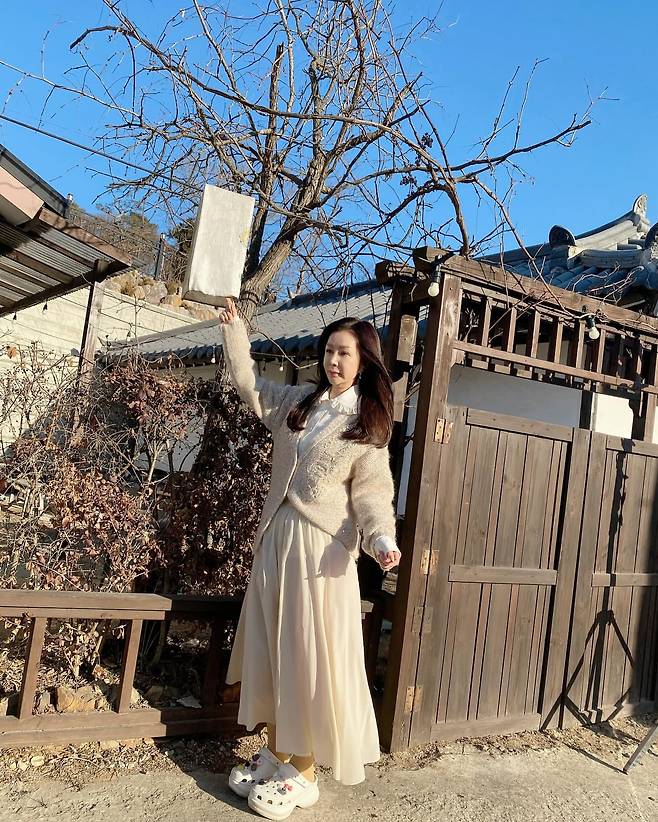 박준금은 크림색 가디건과 롱스커트, 그리고 화이트 크록스를 매치해 내추럴하면서도 편안한 데일리룩을 연출했다. 따뜻한 소재와 부드러운 컬러 조합이 자연스러운 분위기를 강조하며, 소박하면서도 세련된 감각을 보여준다