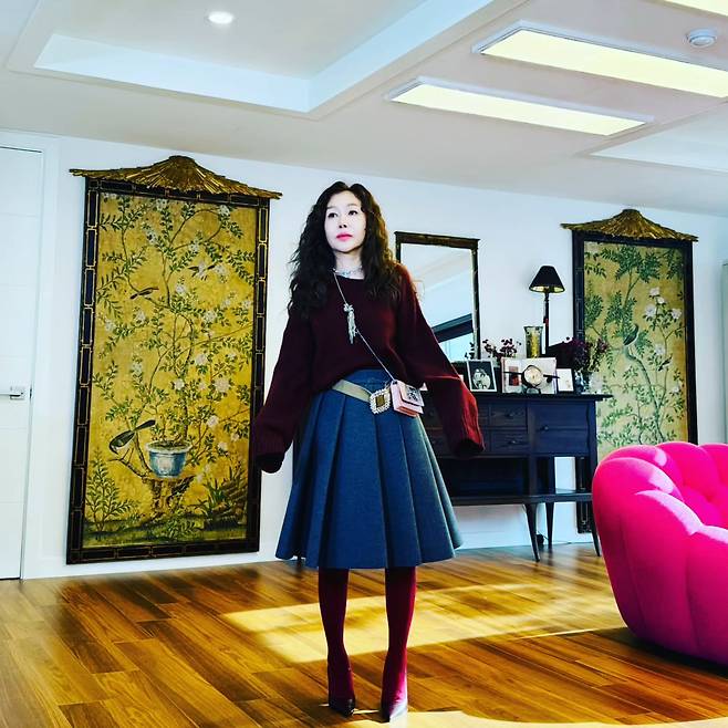 버건디 컬러 니트와 네이비 플리츠 스커트, 그리고 같은 톤의 타이즈와 힐을 매치해 클래식하면서도 고급스러운 스타일을 완성했다. 벨트와 미니백, 롱 네크리스 등 액세서리로 포인트를 더해 박준금만의 우아한 분위기를 연출하고 있다