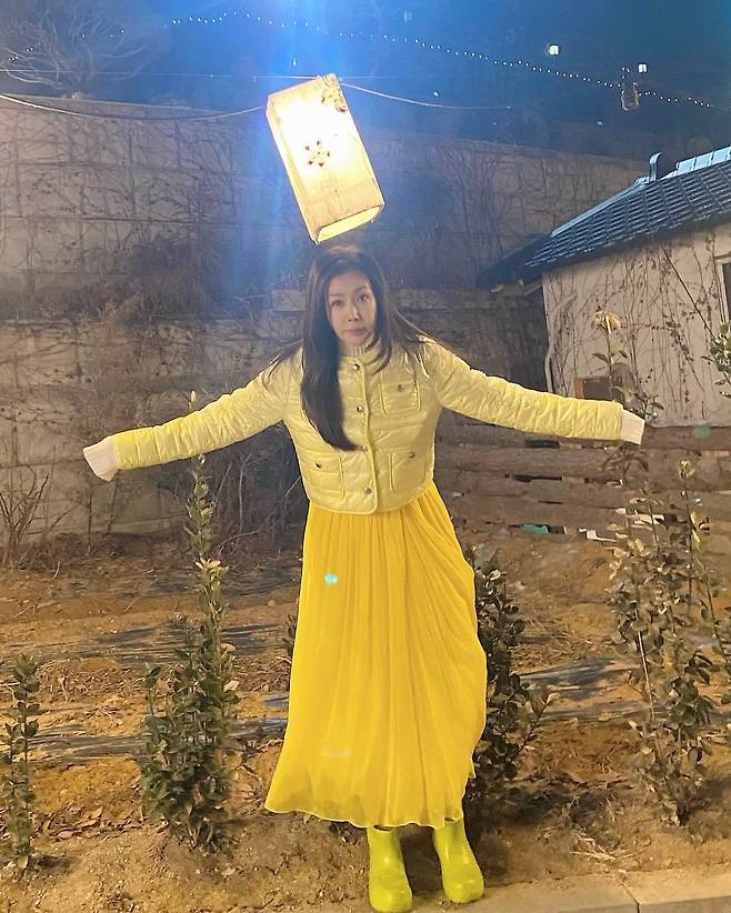 노란색 패딩 재킷과 롱 플리츠 스커트, 그리고 네온 옐로우 부츠를 매치해 통일감 있는 옐로우 모노톤 패션을 선보이고 있다. 밝고 화사한 색감이 박준금의 개성을 드러내며, 야외 조명과 어우러져 경쾌한 분위기를 자아낸다