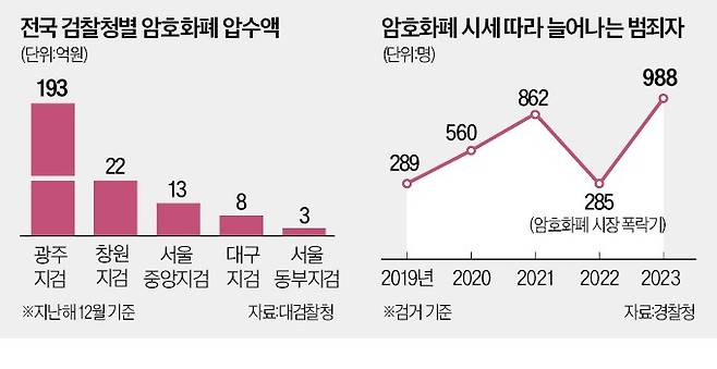 암호화폐 관련 범죄는 매년 빠르게 늘고 있다. 경찰청에 따르면 2019년 289명이던 암호화폐 관련 범죄자는 지난해 988명으로 4년 새 241.8% 늘어났다. 법조계 관계자는 “암호화폐 시세가 높아질 때마다 관련 이슈를 활용해 범죄를 저지르는 수법이 주로 쓰인다”며 “최근 20~30대가 암호화폐를 이용해 은퇴한 중장년층을 노리는 범죄가 늘고 있다”고 말했다.