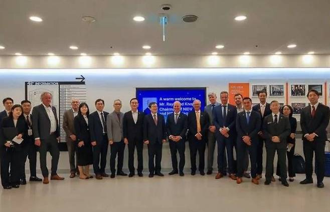 HD현대 무인항공모함 앞에 선 네덜란드 대표단
