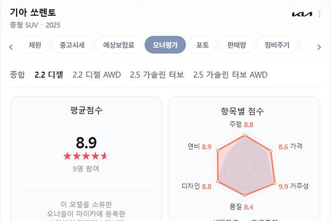 실제 차주들의 평가를 기반으로 차량 만족도 점수를 공개하는 ‘네이버 마이카 오너평가’에 따르면 기아 쏘렌토 2.2 디젤 모델의 평균 점수는 8.9점이다.