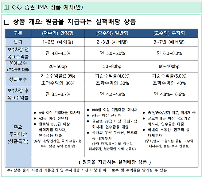 금융위원회에 따르면, 중장기(2~7년) 만기의 중수익(연 3~8%) 상품이 출시될 것으로 보인대요. (자기자본이 8조원을 넘어가는 한국투자증권과 미래에셋증권이 IMA 운용 후보군으로 꼽혀요.)