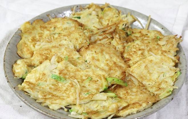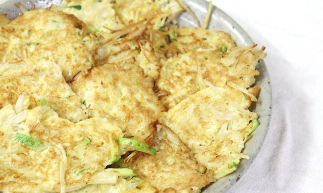 예열한 팬에 기름을 두른 뒤 한 숟가락씩 떠서 중약불에 앞뒤로 노릇하게 구워줍니다. 완성된 전 위에 참기름을 살짝 둘러주면 고소한 풍미가 더욱 살아납니다. 보다 바삭한 식감을 원하신다면 전분을 한 스푼 정도 추가하셔도 좋습니다.