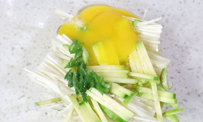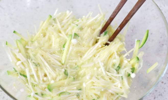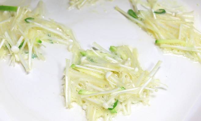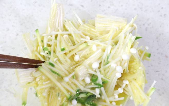 적당한 길이로 자른 팽이버섯에 달걀 두 개, 부침가루 또는 밀가루 두 스푼, 소금 약간을 넣고 잘 섞어줍니다. 기호에 따라 다진 부추, 당근, 양파 등을 함께 넣어도 좋습니다.