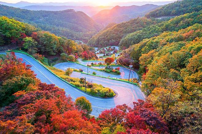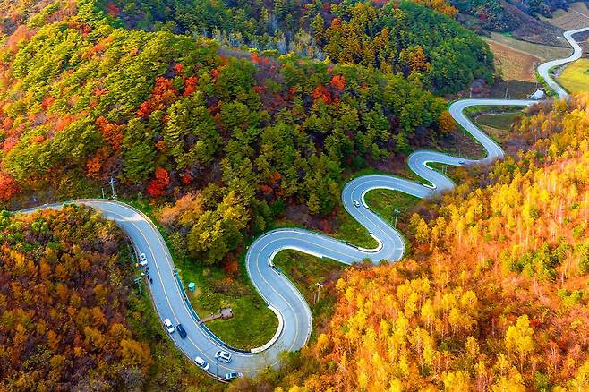 해산령은 가을 드라이브를 떠나기 완벽한 곳으로 초록빛, 붉은빛, 황금빛 다채로운 단풍으로 물들여진 장소입니다.