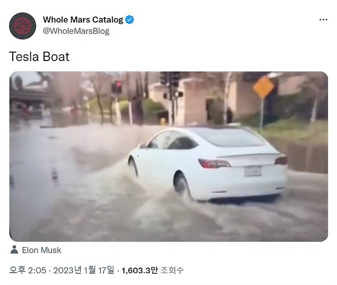 해외 전기차 전문매체 인사이드EV에 따르면 최근 미국의 한 트위터 유저가 "테슬라 보트"라는 짧은 글과 함께 침수 지역을 주행하는 모델 3 영상을 공개해 사람들을 놀라게 했다.