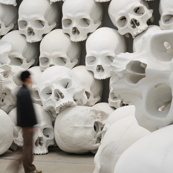 이번 전시의 하이라이트는 2m에 달하는 거대 두개골 형상 100개를 쌓아 올린 ‘매스(2016~2017)’입니다. 전시장 바닥부터 천장까지 층층이 쌓인 두개골 앞에서 관람객들은 발걸음을 떼지 못했습니다. ‘매스(Mass)’가 더미, 군중, 종교의식을 뜻하는 것처럼 두개골의 상징도 다층적입니다. 뮤익은 “인간의 두개골은 복잡한 오브제이며 우리가 한눈에 알아보는 강렬한 그래픽 아이콘입니다. 친숙하면서도 낯설어 거부감과 매력을 동시에 주는 존재입니다. 무의식적으로 우리의 주의를 끌어 외면할 수 없게 만든다”고 했습니다. 뮤익은 전시 장소의 건축과 특성에서 영감을 받아 작품을 구성하기 때문에 ‘매스’는 전시될 때마다 새로운 구조로 관객을 만납니다.