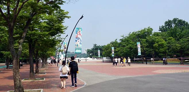 줄을 빙 둘러서 외부 풍경을 담아보았습니다. 경기장을 빙 두른 커다란 일러스트가 인상적입니다.