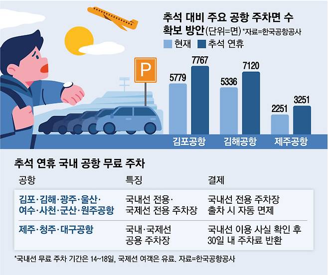 추석 연휴 전날인 13일부터 18일까지 147만여 명이 이들 공항을 이용할 예정이다. 이 가운데 주차장을 무료로 이용할 수 있는 국내선 여객은 112만 명에 달한다.