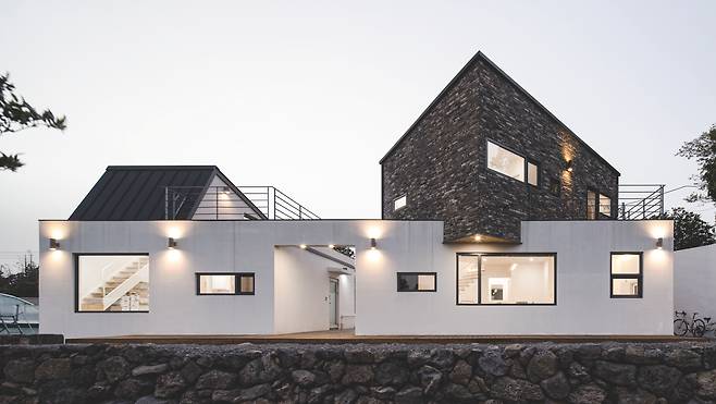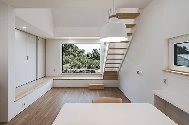 공유 공간으로 사용하는 1층은 남쪽에 넓은 창을 내 귤밭과 제주 풍경을 끌어들였다. 그 위에 얹어 있는 2층은 가족 침실이다. 2층은 사적인 공간이라 축을 살짝 비틀어 색다른 풍경을 담아내면서 자연스럽게 게스트룸에서 주인집으로 향하는 시선이 차단되게 했다.