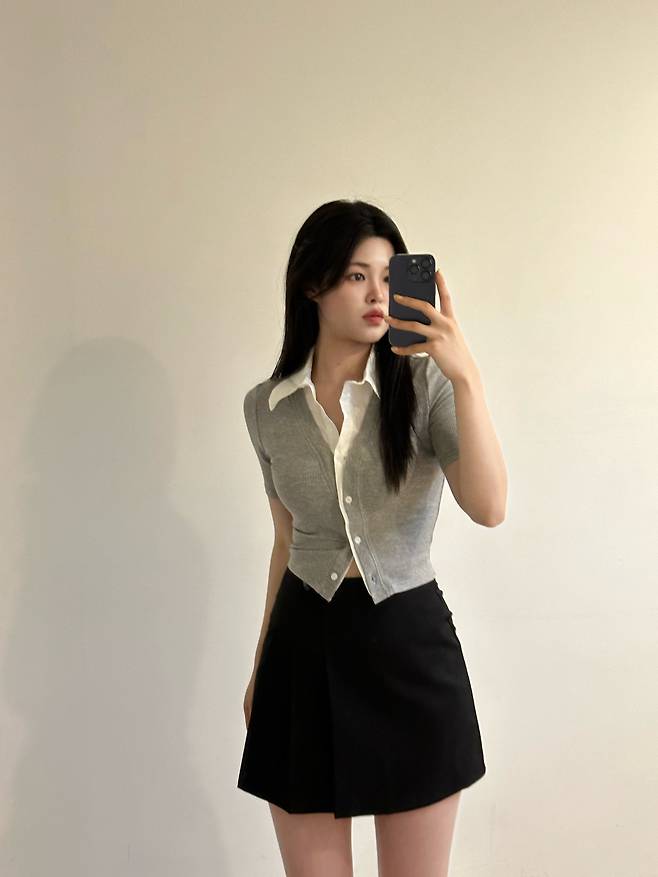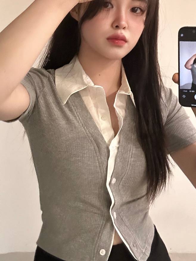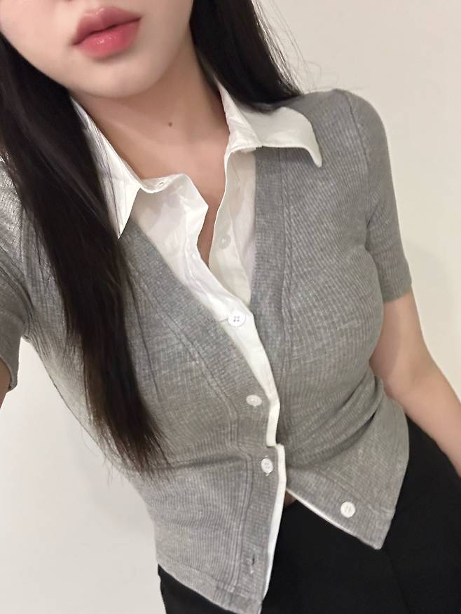 니트 카디건과 셔츠를 같이 단추 부분까지 신경 써서 코디해 입은 것 같은