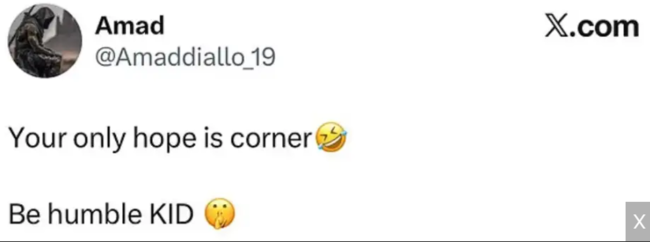 아마드는 해당 아스널 팬의 게시물에 대한 답글로 “너희가 기대할 건 코너킥뿐이다. 겸손해라 꼬마야”라며 ‘조용히 하라’는 이모티콘을 덧붙였다. 실제로 아스널은 이번 시즌에도 강력한 세트피스 전술로 재미를 보고 있었지만, 세트피스에 의존하는 경향이 강하다는 비판도 받아왔다. 아마드는 경기력으로 아스널을 꺾은 뒤, 단 한마디로 통쾌한 복수에 성공했다.