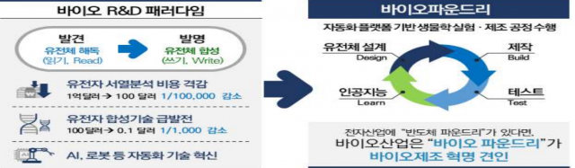 반도체 산업에서 고객의 주문을 받아 전문적으로 생산하는 파운드리가 발전하는 것처럼 합성생물학에서는 바이오 파운드리가 필수적이다. 김장성 한국생명공학연구원장은 “바이오 파운드리는 치료제, 백신, 친환경 석유화학 대체 화학 물질, 다양한 기능의 천연 물질, 바이오 플라스틱 등을 효과적으로 생산할 수 있는 세포 공장을 만드는 것”이라고 했다. 실례로 바이오 플라스틱 생산 과정을 보면 컴퓨터 가상 세포를 활용해 대사 회로를 설계하고 관련 효소와 이를 코딩하는 유전자를 찾아 클로닝(인공적인 방법으로 부모와 유전적으로 똑같은 아이를 만드는 일)한다. 이후 플라스틱을 고농도·고수율·고생산성으로 생산하기 위한 발효 공정과 분리 정제 공정을 개발한다. 고서곤 과학기술정보통신부 연구개발정책실장은 “인공지능(AI)과 로봇 기술을 접목해 합성생물학의 표준화·고속화·자동화를 꾀하는 게 관건”이라고 했다. 이 부총장은 “앞으로 바이오 파운드리 없이 세포 공장을 만드는 것은 수작업으로 반도체를 만들겠다는 것과 같게 될 것”이라며 “기후변화 및 환경 파괴, 식량과 에너지 부족, 초고령화 시대 건강 악화에 효과적으로 대응하는 데 유용하다”고 설명했다. 미국·유럽·일본·싱가포르 등이 바이오 파운드리 구축에 많은 투자를 하는 것은 이 때문이다.