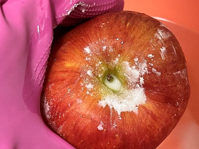 그다음 사과를 꺼내서 손이나 부드러운 수세미로 문질러서 닦아 냅니다. 그리고 흐르는 물에 깨끗이 헹궈 잔여물이 남지 않게 하세요.