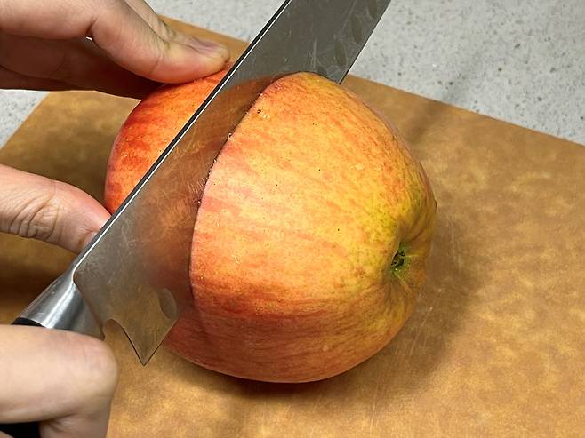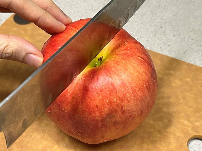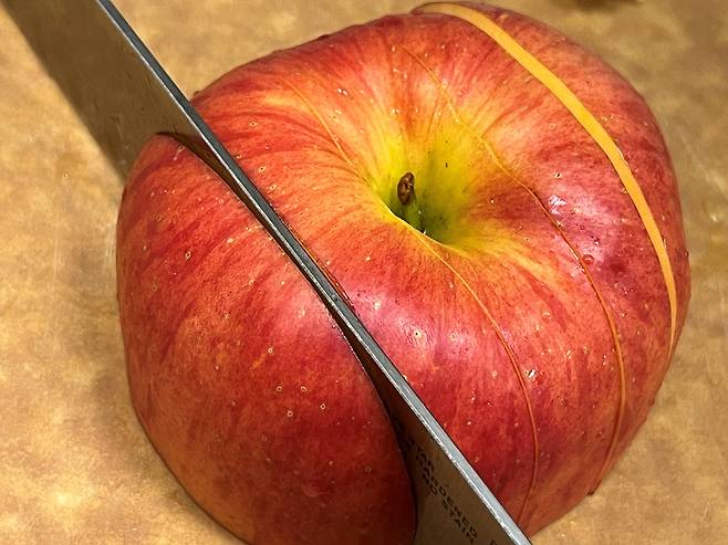 이제부터 사과를 자를 때는 반드시 눕혀서 잘라 보세요. 눕힌 상태에서 반으로 잘라 줍니다. 이렇게 자르면 사과 섬유질의 결을 따라 자르게 되어 식감이 아삭하고 단맛이 더욱 진하게 살아납니다.