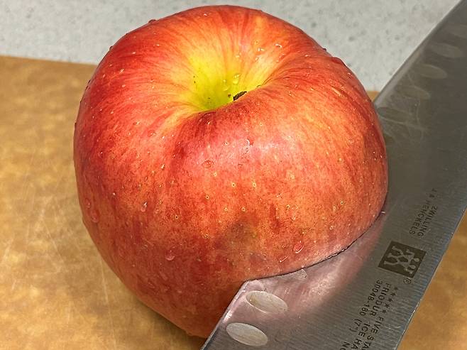 오늘부터는 사과를 세우지 말고, 눕혀서 자른 후 손질해 보세요. 눕혀서 자르는 것만으로도 단맛이 진해지고 과육의 아삭함이 살아나며, 꼭지 부분까지 깔끔하게 손질할 수 있습니다.