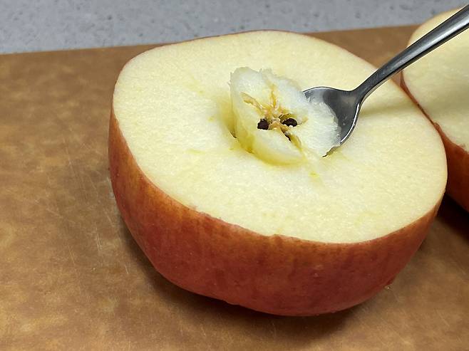2등분으로 자르면 단면에 사과씨가 모여있는 것을 볼 수 있습니다. 이 부분은 칼을 사용할 것도 없이 작은 스푼으로 둥글게 파내면 쉽게 씨를 제거할 수 있습니다.
