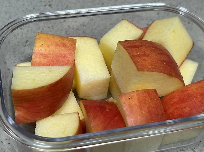 사과를 보통은 세로로 세워서 자르셨을 텐데요. 이렇게 하면 사과 조각마다 나오는 씨와 꼭지 부분을 하나씩 도려내야 하는 단점이 있습니다. 또한 세워서 자른 면은 공기와 접촉하는 면적이 넓어 갈변이 빨리 일어납니다.
