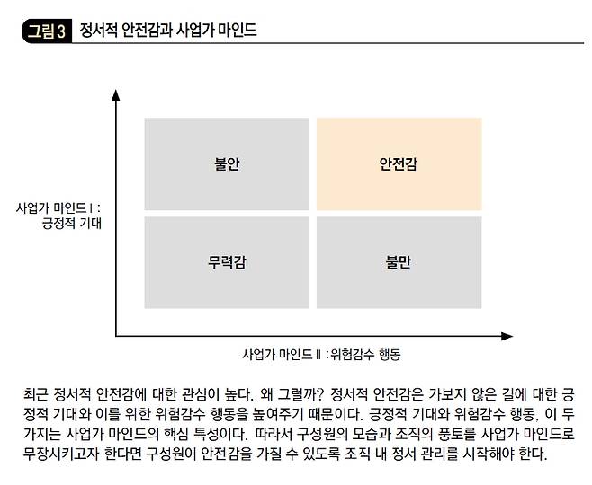 조직활성화에 있어 정서가 홀대돼서는 안 되는 또 하나의 이유는 정서가 사업가 마인드와 연결돼 있기 때문이다. 정서에 함께 기반한 질 높은 신뢰 관계와 그로 인해 안정감을 갖게 되는 것은 사업가 마인드에 가장 중요한 요소인 긍정적 기대와 위험 감수 행동을 강화한다.