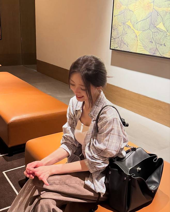 유나가 보여준 이번 스타일은 편안한 실루엣의 체크 셔츠와 슬림한 이너를 매치해 자유로우면서도 여성스러운 선을 강조한 데일리룩이에요.