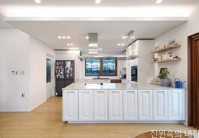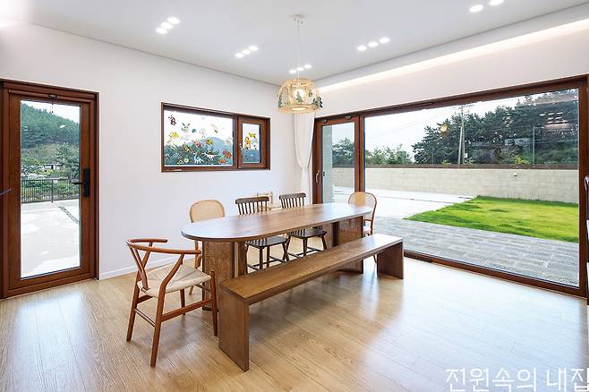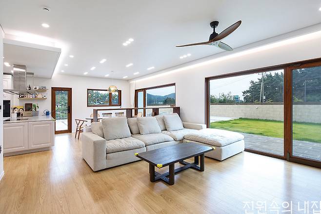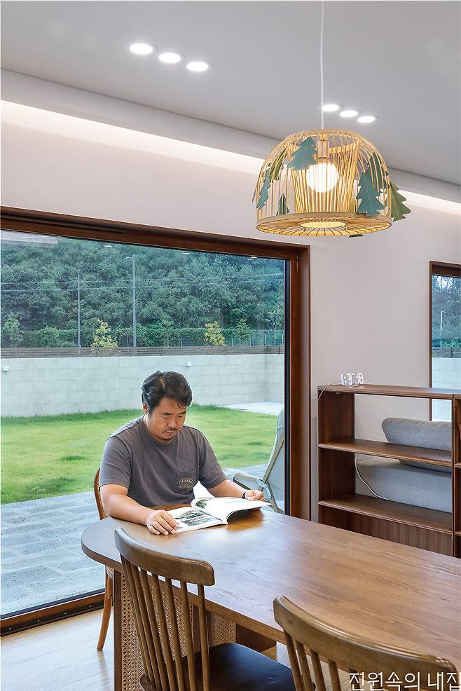 1층은 거실과 다이닝 공간, 주방이 하나로 개방되어 시원한 공간감을 형성한다. 전체적으로 깔끔한 분위기와 함께 눈길을 끄는 것은 우드 포인트다. 휴양지 리조트의 콘셉트를 가져오기 위해 화이트와 우드 톤을 활용하고자 했고, 특히 창호는 컬러 선택에 애를 먹었지만 집 전체에 따듯하고 평온한 분위기를 만들어 주는 역할을 하고 있다. 여기에 공간 곳곳에 크게 열린 창으로 인해 집은 항상 밝게 유지되고, 실내 공간이 외부로 확장되는 듯한 느낌을 만든다.