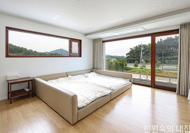 안방과 아이 방, 게스트룸이 있는 2층은 작은 발코니를 통해 공간들이 서로 이어진다. 안방에는 드레스룸과 메인 욕실을 함께 구성해 동선을 최소화했다. 욕조 앞으로 큰 창을 과감하게 열어 주택에서만 만끽할 수 있는 색다른 욕실 풍경이 완성되었다.