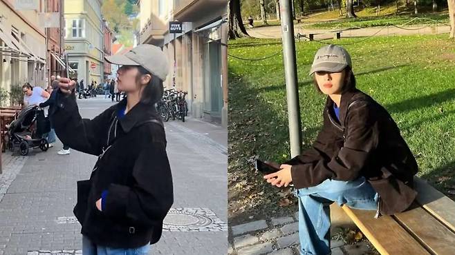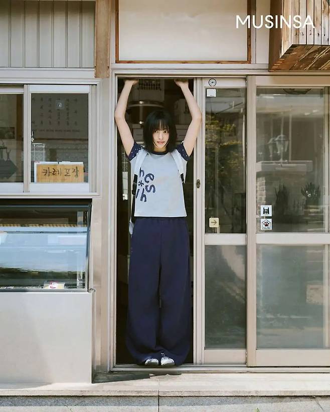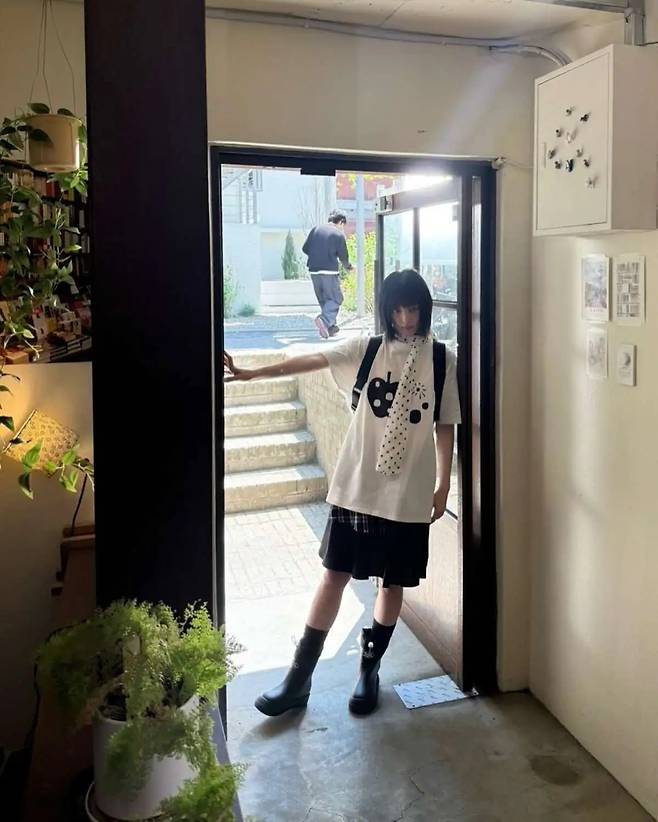 신발은 화이트 스니커즈로 마무리해 편안함과 활동성을 동시에 챙겼다. 이 코디는 친구와의 가벼운 만남이나 여행길에 자연스럽게 어울리며 김보라 특유의 발랄한 매력을 강조한다. 문 앞에 기대어 두 팔을 위로 올린 포즈는 소녀 같은 자유로움을 더한다.