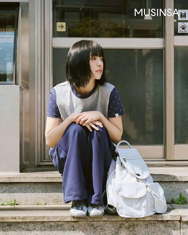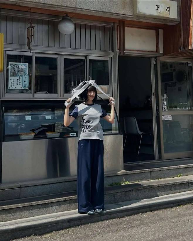 첫 번째 룩은 회색 레터링 티셔츠와 네이비 와이드 팬츠의 조합이다. 소매 부분이 네이비로 배색된 티셔츠는 단조롭지 않은 포인트를 주며 어깨 라인을 부드럽게 감싼다. 여기에 통이 넓은 팬츠를 매치해 전체적으로 자유로운 분위기를 완성했다.