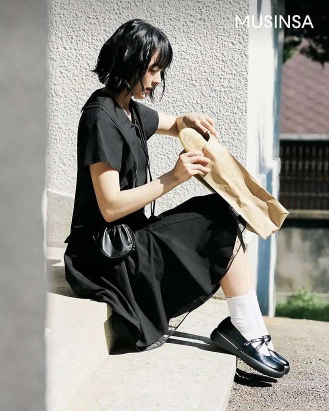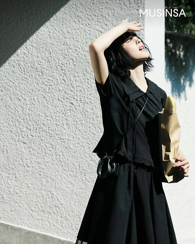세 번째 룩은 올블랙 스타일링이 주는 힘을 보여준다. 블랙 블라우스는 리본 장식과 프릴 디테일이 들어가 있어 단순하지 않고 세련된 느낌을 준다. 함께 매치한 스커트는 풍성한 라인으로 드라마틱한 분위기를 더한다. 여기에 작은 사이즈의 미니 크로스백을 곁들여 시크함을 강화했다. 특히 손에 든 바게트와 햇살을 가리며 고개를 든 장면은 마치 프랑스 영화 속 한 장면 같은 인상을 남긴다. 블랙이라는 색이 자칫 무거워 보일 수 있지만 디테일과 연출을 통해 우아함을 강조한 스타일링이다.