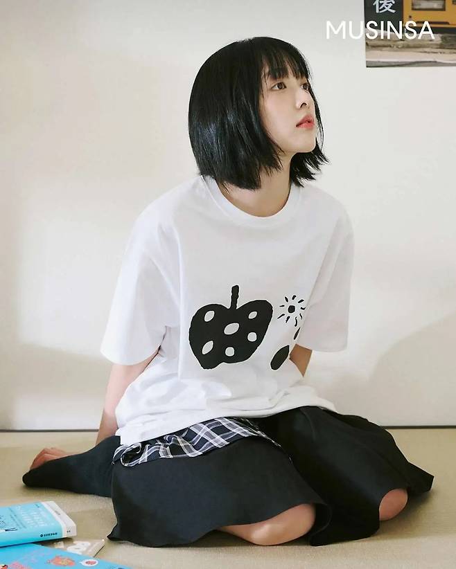 두 번째 룩은 오버핏 화이트 티셔츠와 블랙 스커트를 중심으로 연출됐다. 티셔츠는 큼직한 프린트가 들어가 있어 시선을 끌며 루즈한 실루엣이 편안한 무드를 만든다. 블랙 스커트는 무릎 위 길이로 경쾌한 느낌을 주고 안쪽에 체크무늬가 살짝 보이는 레이어드 디테일이 숨어 있다.