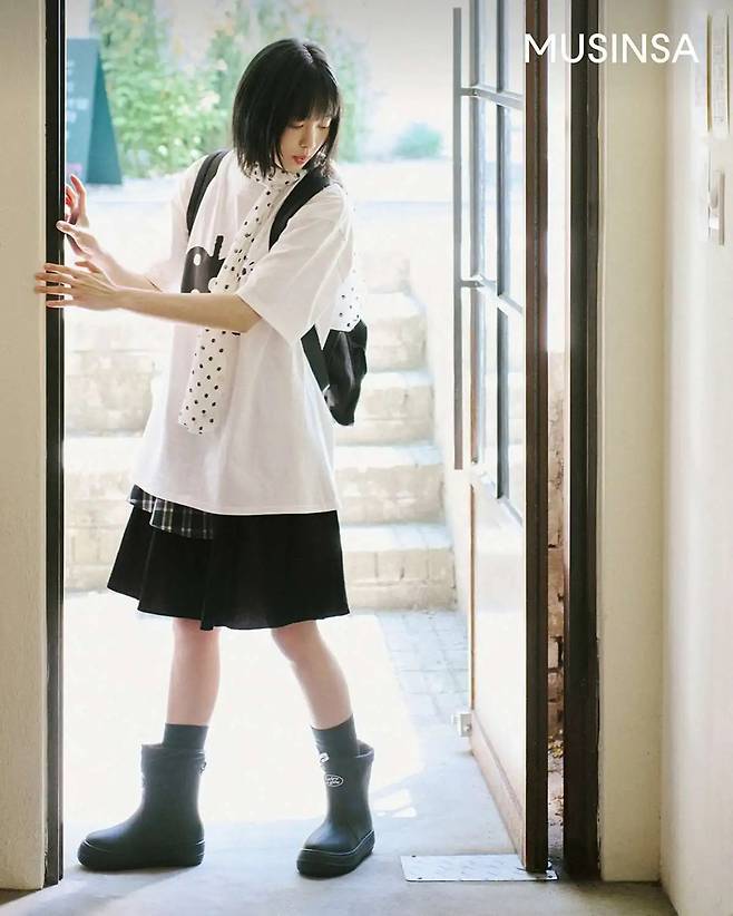 여기에 도트 패턴 머플러를 목에 가볍게 두르며 발랄한 포인트를 주었고 블랙 백팩으로 실용성을 더했다. 신발은 블랙 레인부츠를 선택해 독특한 인상을 남긴다. 평범한 데일리 아이템 속에 개성적인 신발을 매치한 것이 돋보이며, 비 오는 날에도 어울릴 법한 실용적인 스타일링으로 완성된다.