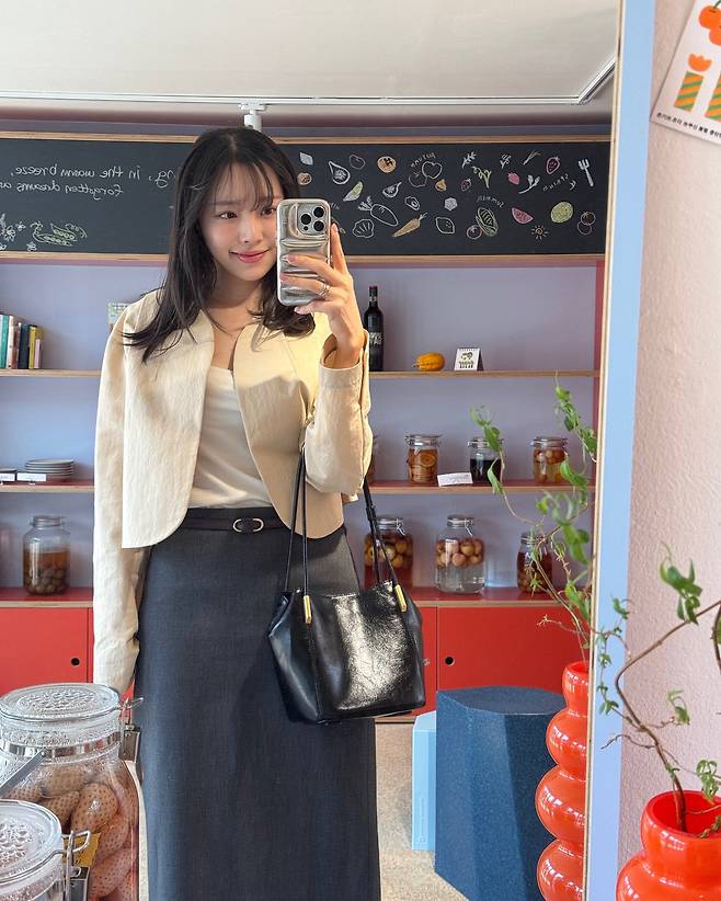 아늑한 카페 내부에서 셀카를 찍는 이솔이의 모습이 눈길을 끈다. 아이보리 크롭 재킷과 화이트 이너를 매치하고 그레이 스커트로 세련된 오피스 룩을 완성했다. 블랙 벨트로 허리라인을 강조하며 균형 잡힌 실루엣을 연출하고 있다. 블랙 숄더백은 전체적인 스타일에 통일감을 주며, 배경의 따뜻한 색감과 조화를 이루고 있다.