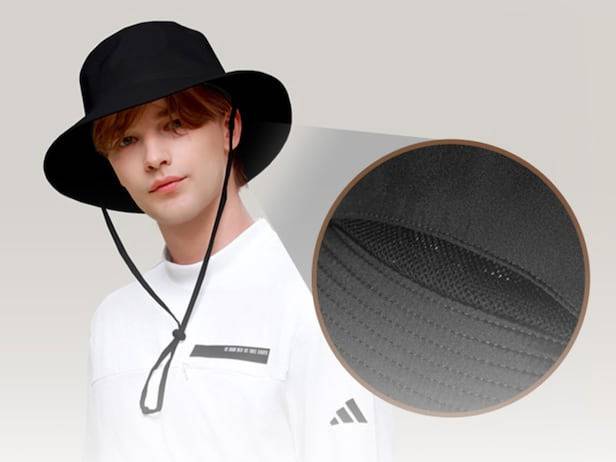 가볍지만 탄탄한 소재입니다. 와이어가 없어도 한결같은 핏을 유지하죠. 이리저리 접어서 보관해도 구김이 가지 않아 쉽게 관리할 수 있습니다. 생활 방수가 돼 예상치 못한 비를 막을 수도 있죠. 이마가 닿는 부분은 땀 흡수력이 높은 소재로 덧댔습니다.