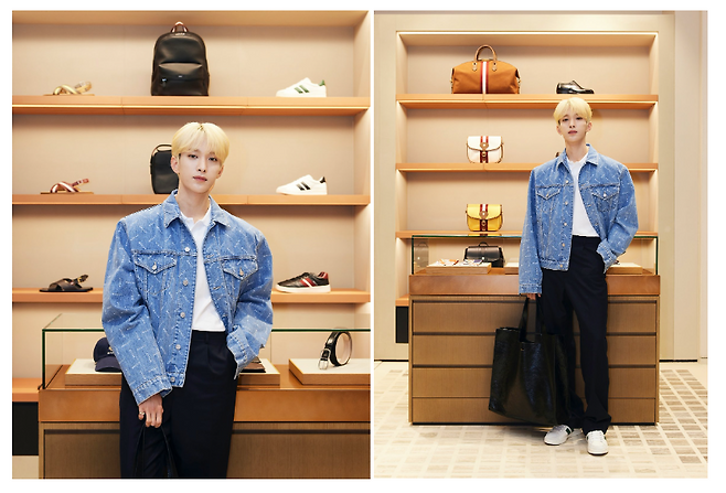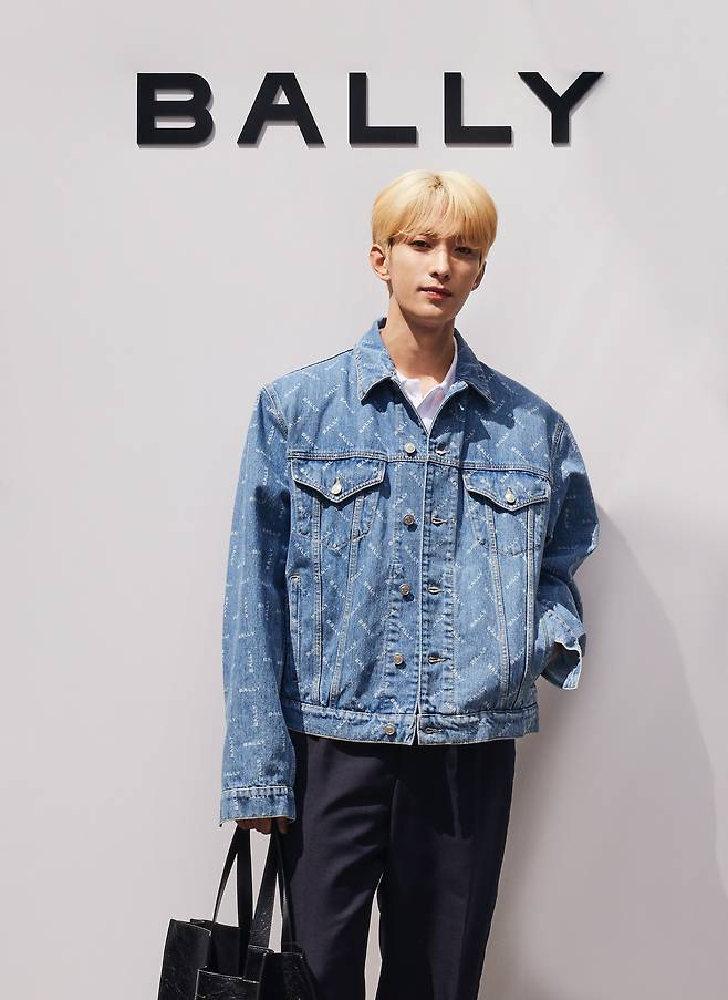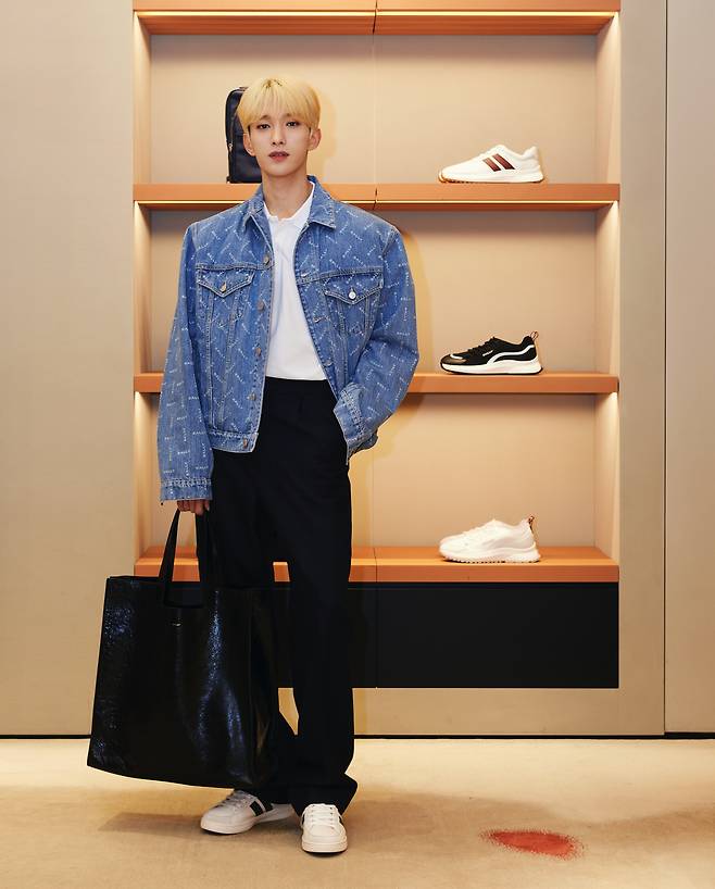 도겸은 발리 Bally의 글로벌 앰버서더로서 데님 자켓 안에 발리 화이트 폴로 셔츠와 네이비 컬러의 팬츠, 스니커즈 그리고