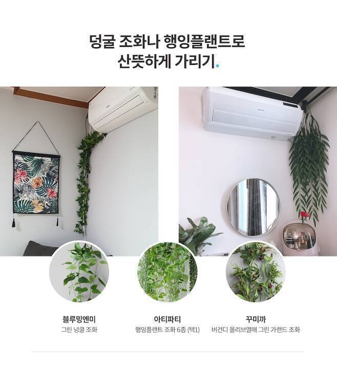 좀 더 색다르게 연출하고 싶다면 아래로 늘어지는 모양의 식물을 걸어주면 좋아요. 보기 싫은 에어컨 배관과 코드도 가리고, 그린테리어도 완성할 수 있어요.