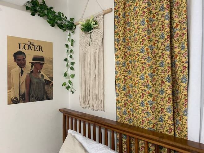 배관에 감긴 덩굴 조화만 벽에서 돋보일까 걱정이라면, 아래 사진처럼 주변 벽에 마크라메나 포스터를 걸어 자연스럽게 커버해주는 것도 좋아요.