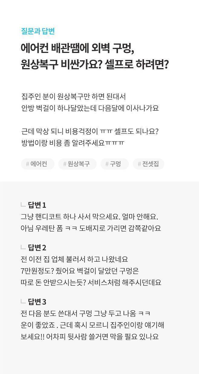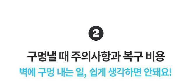그러니 구멍을 막아야 하는 상황이라면 답변 2와 같이 반드시 전문가를 통해 원상복구 시공을 하시길 권장해요. 비용은 7~10만원정도 들어요.