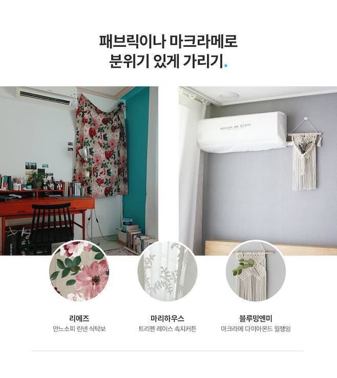 바란스 커튼이나 가리개, 패브릭 포스터 등 어떤 패브릭이라도 가능해요! 꼭꼬핀이나 3M 코맨드를 이용해서 간단히 달아줄 수 있죠. 예쁜 마크라메도 좋은 가림막이 되어준답니다.