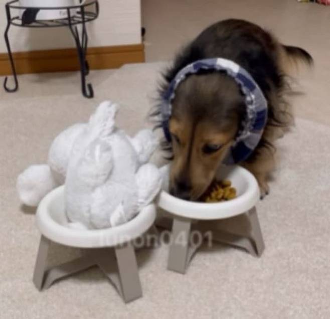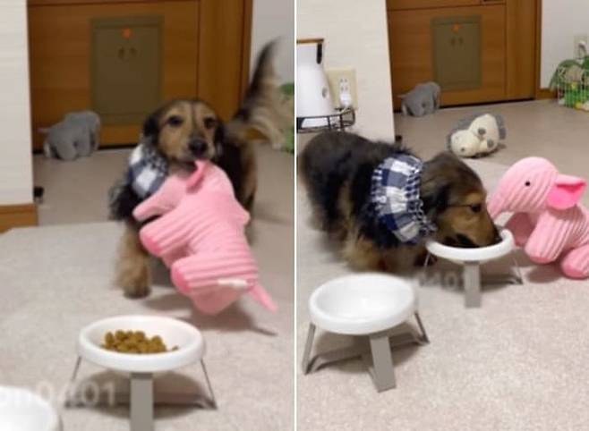 밥그릇을 보더니 인형 친구들을 내팽개치며 밥 먹느라 정신 없는 닥스훈트 강아지인데요. 그런데 신기한 것은 이 같은 행동을 매일, 매번 한다는 것이었죠.