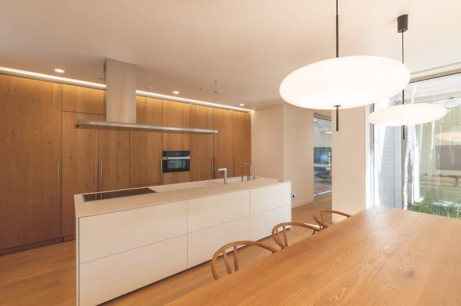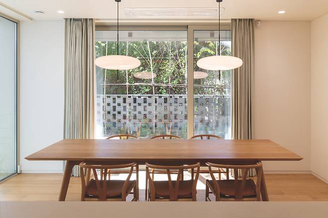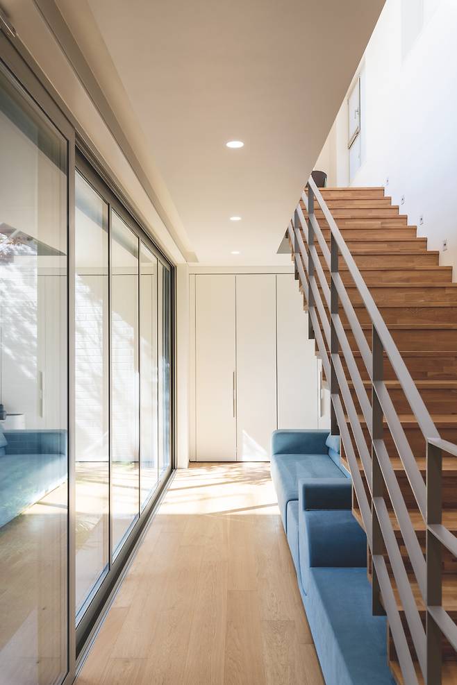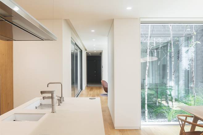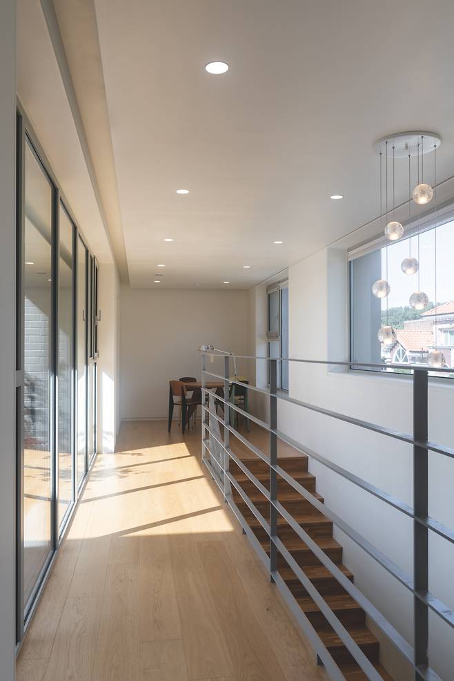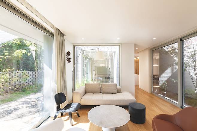 1층 거실에서는 주방과 거실 사이 조그마한 정원, 거실 바깥쪽 마당, 2층 테라스까지 시선이 닿는다. 이런 시선의 교류를 통해 각 공간에 연결성 및 입체적인 시야감을 부여했다. 동시에 서로 다른 위치에 있어도 가족 간 유대를 느낄 수 있도록 유도했다.