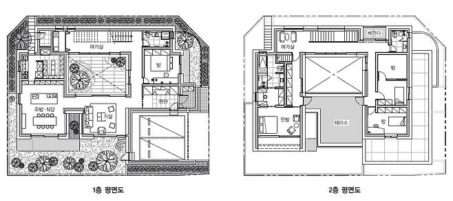 2층은 1층 공간을 90도 회전시킨 배치로 계단실로 올라오면 부부방과 자녀방으로 동선이 나뉜다. 욕실은 부부방에 포함시키거나 계단실과 가까운 곳에 별도로 하나 더 마련해 부부와 자녀 모두가 사용하는데 불편함이 없도록 배치에 유의했다.