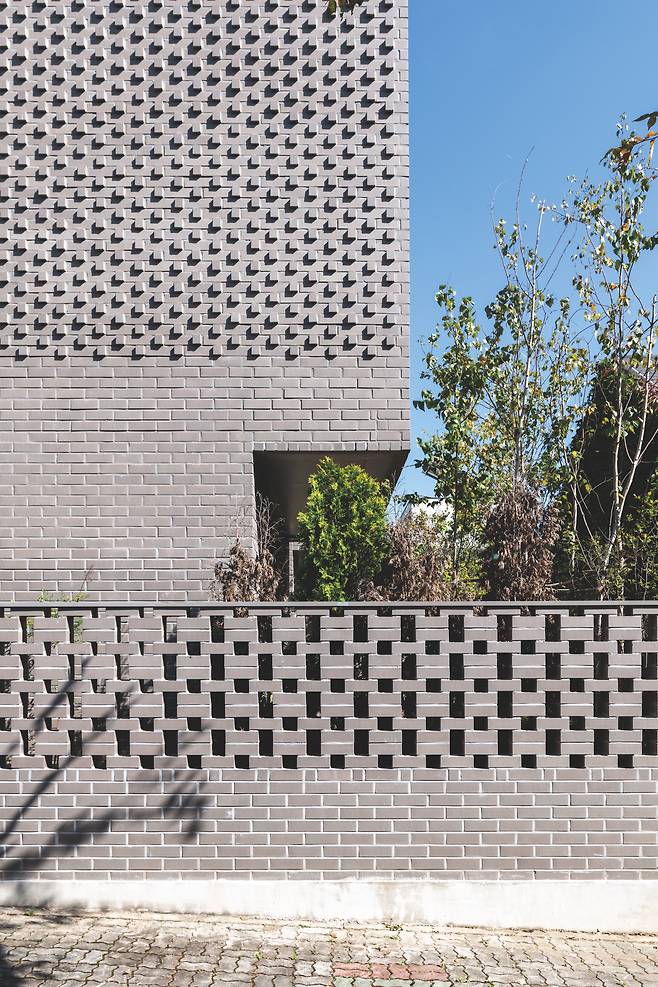 여러 아이디어를 떠올리며 고민한 끝에 벽돌과 벽돌 사이 공간을 비우며 쌓는 방법을 채택했다. 담장에 생긴 작은 사이공간들은 건물 내부에서 외부를 바라볼 수 있는 시야를 확보해준다. 뿐만 아니라 늦은 저녁 건물 안에서 나오는 은은한 불빛은 담장을 통해 어두운 길을 지나는 사람들에게 따스한 조명이 돼준다.