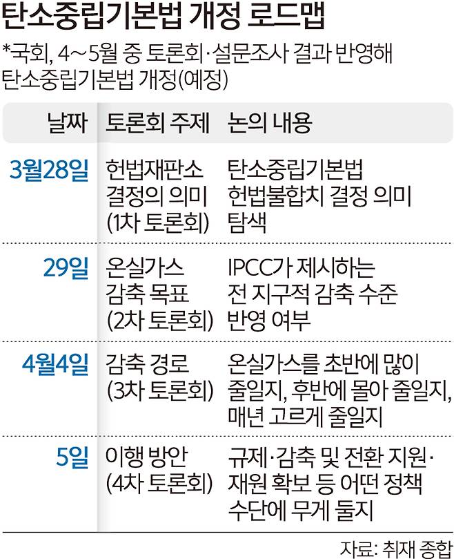시민대표단은 다음 달 5일까지 4차례 토론을 한다. 토론 주제는 ‘헌법재판소 결정의 의미’, ‘감축 목표’, ‘감축 경로(속도)’, ‘이행 방안’ 순으로 짜였다. 토론회 결과 등은 국회 기후위기특위에 전달돼 향후 관련 법 개정 논의 과정에 활용된다.