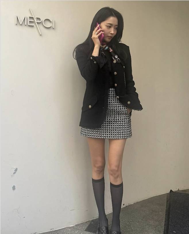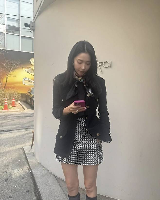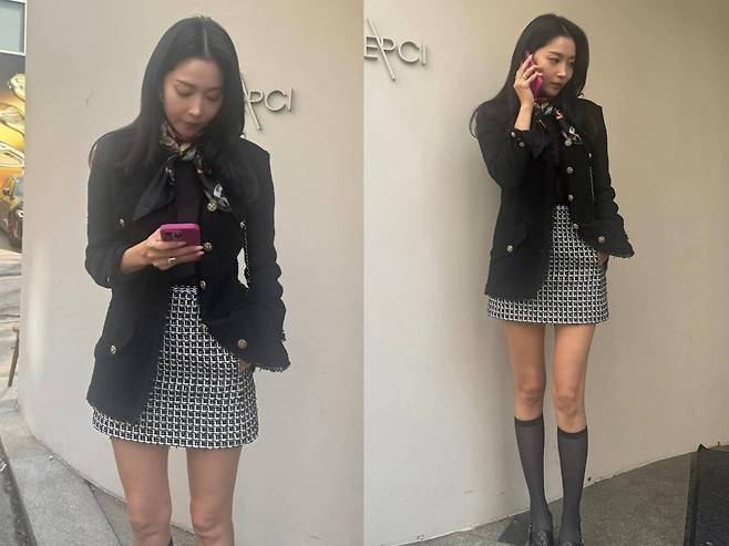 금장 버튼이 포인트인 블랙 트위드 재킷은 고급스러운 실루엣을 강조했으며, 체크 패턴 미니 스커트와의 매치는 절제된 관능미를 더했습니다.