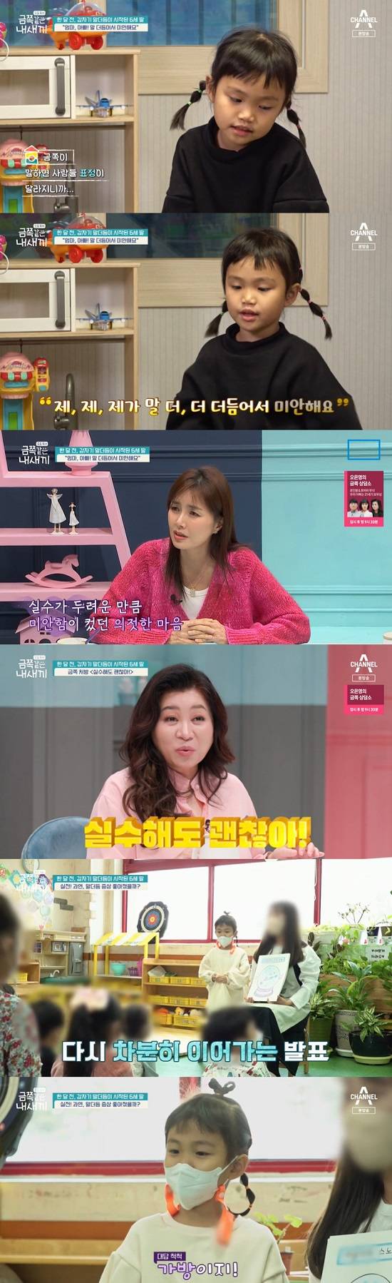 이어 금쪽이는 "친구들은 말 잘하는데, 나는 말을 더듬는다"며 자신이 말을 더듬고 있다는 사실을 알고 있음과 이에 대한 불편함을 표했다.