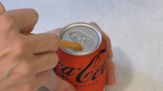 방법은 나무젓가락 뭉특한 부분을 이용해서 캔 뚜껑을 여러 번 문지르세요. 그러면 신기하게도 뚜껑이 뽕! 하고 금세 열리게 된답니다. 너무 힘을 주지 않으셔도 누구나 쉽게 열 수 있어 좋아요.
