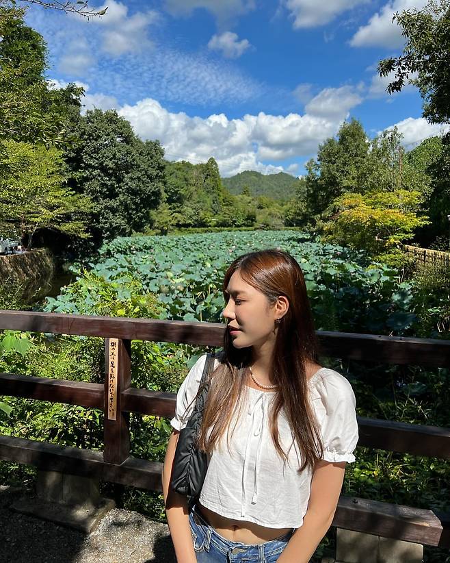 스텔라 전율은 연못을 배경으로 한 자연스러운 화이트 블라우스 룩을 연출하고 있다. 퍼프 슬리브 디테일이 돋보이는 크롭 블라우스와 데님 팬츠의 조합으로 캐주얼하면서도 로맨틱한 분위기를 완성했다. 특히 블라우스의 리본 타이 디테일이 여성스러운 매력을 더하며, 펄 목걸이로 우아함을 포인트로 살린 것이 인상적이다.